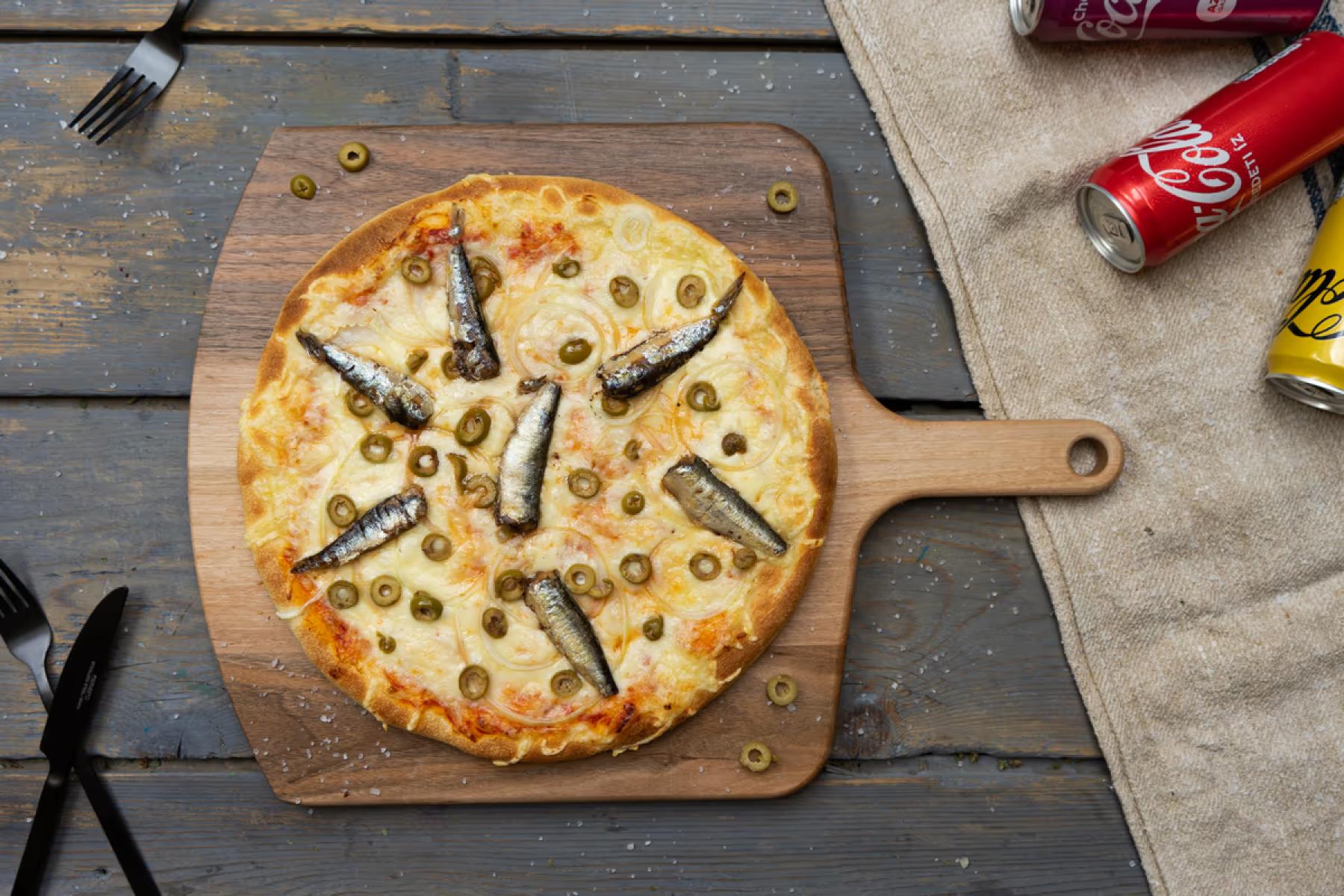 • Siciliana Paradicsomszósz, sajt, hagyma, szardínia, olivabogyóGluténTejHal