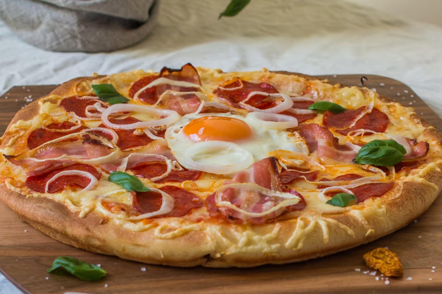• Duna Paradicsomszósz, sajt, sonka, tojás, császárszalonna, hagyma, kolbászGluténTejTojás
